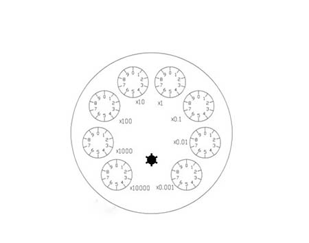 再認指針:認讀時首先要弄清四個黑色指針的單位和它們的進位關(guān)系。圖中四個黑色指針示值標盤按逆時針從上往下,依次是個位針(×1)、十位針(×10)、百位針(×100)、千位針(×1000)?!?span lang="EN-US">1的指針轉(zhuǎn)一圈,×10的指針走一個字;×10的指針轉(zhuǎn)一圈,×100的指針走一個字;×100的指針轉(zhuǎn)一圈,×1000的指針走一個字。